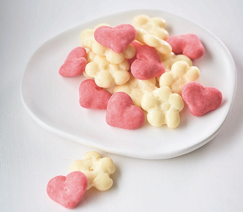 期間限定バレンタインあげもちミックス。ハート型の「イチゴショコラ」と花形の「ホワイトショコラ」をミックスしたバレンタイン限定商品。
