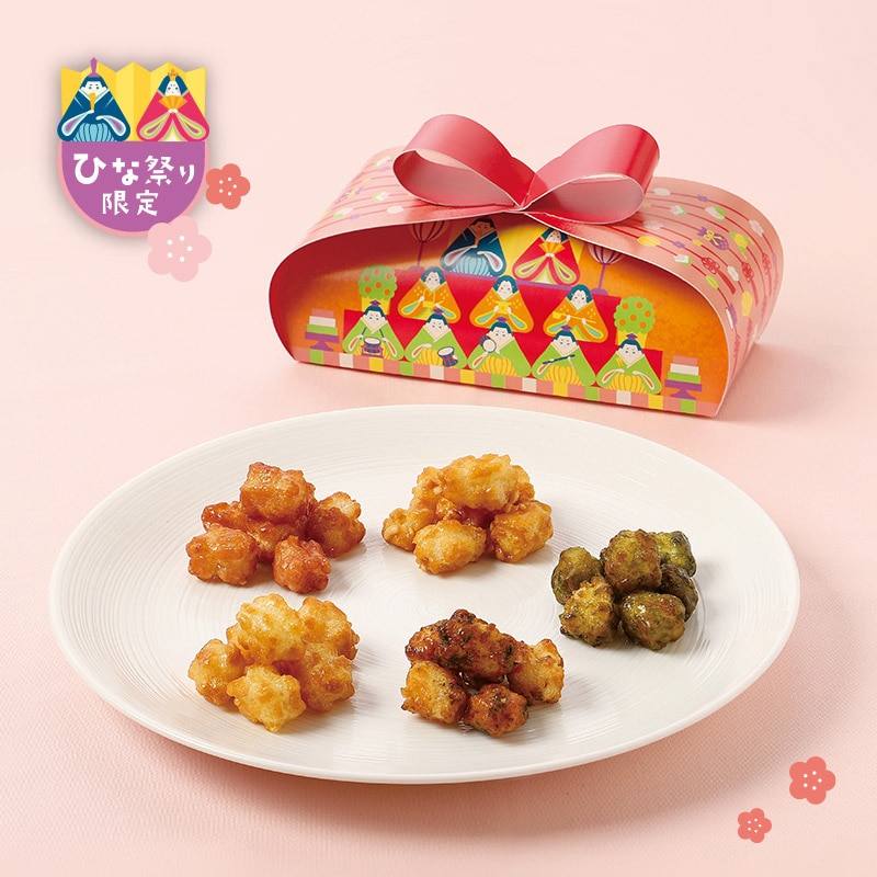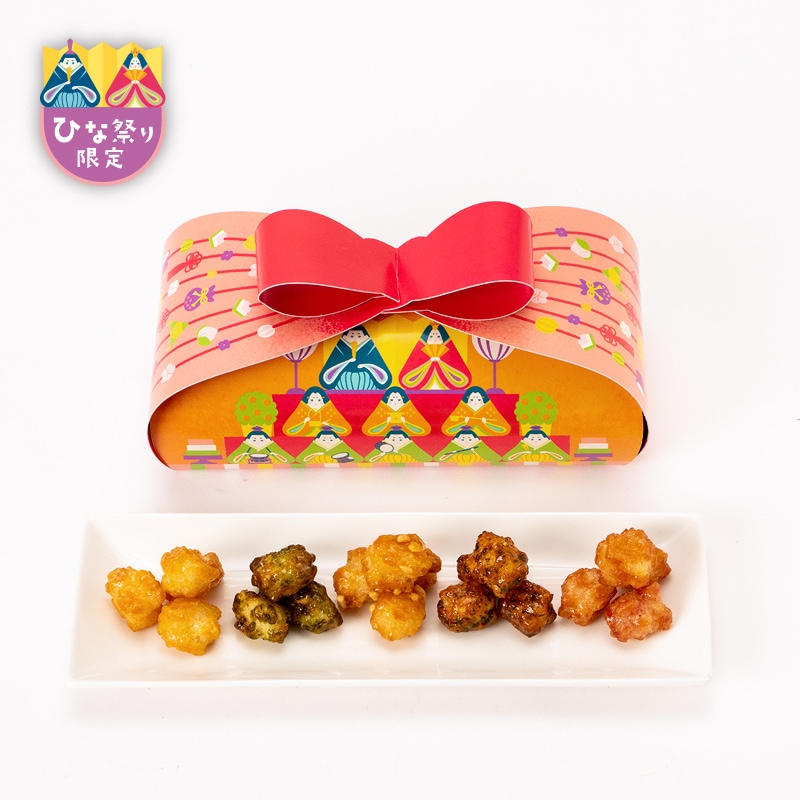 かわいいひな祭り限定BOXをご用意しました。コロコロと丸い形のあられを、五色そろえた 揚げあられです。