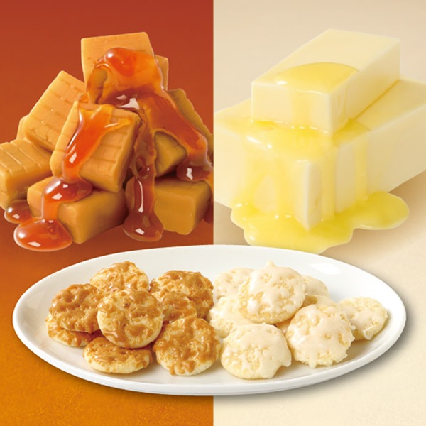 生地の食感とメレンゲの優しい甘みが相性良く絡んだおかき。バターとキャラメル、2種類のお味をお楽しみください。